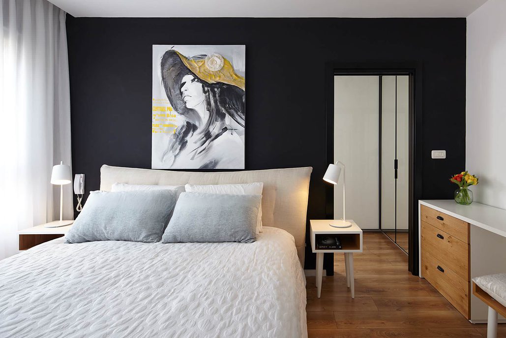 בחדר שינה חזרתי עם הקיר השחור, ברקע גב המיטה בגוון טבעי ובו דלת סתרים שדרכה נכנסים לחדר הארונות ולמקלחת הורים.
